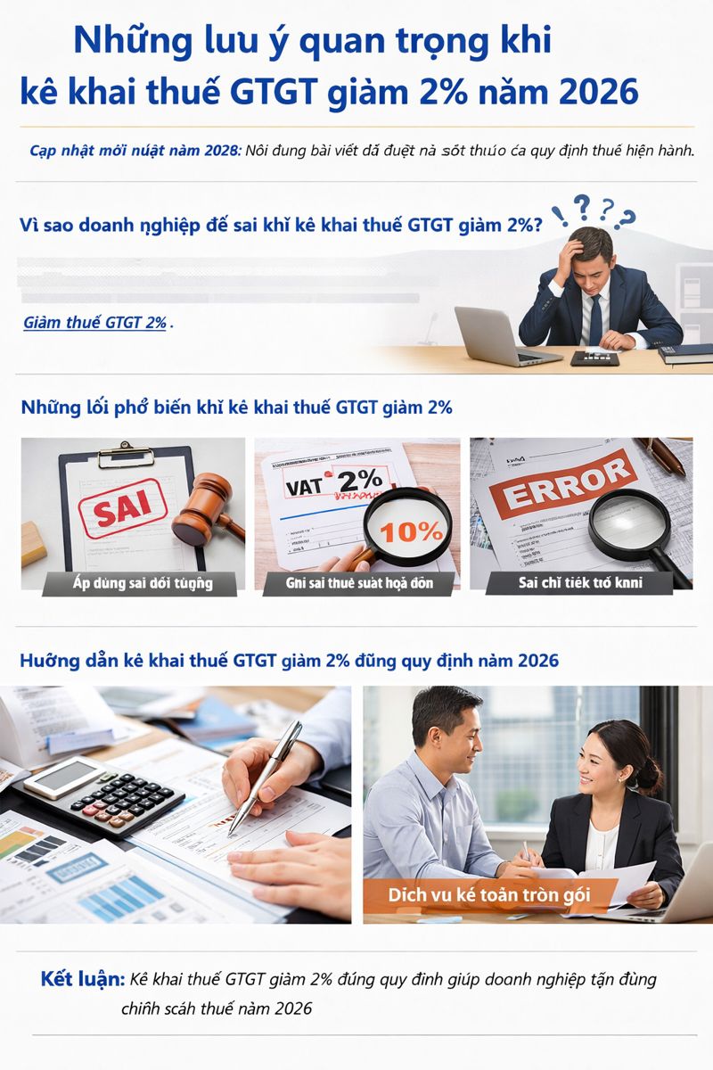 Cập nhật mới nhất năm 2026: Nội dung bài viết đã được rà soát theo các quy định thuế hiện hành. Những lưu ý quan trọng khi kê khai thuế GTGT giảm 2% năm 2026